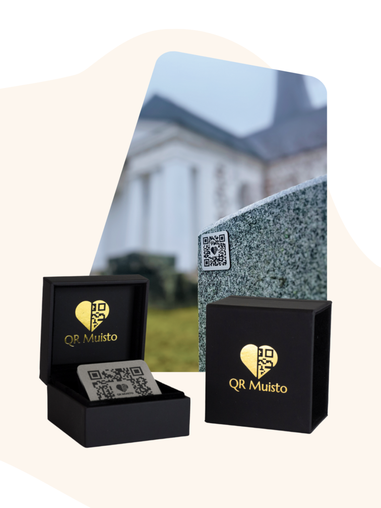 QR Muistolaatta on hautakiveen helposti kiinnittyvä ja säänkestävä. Pohjanmaalla valmistettu, pakkauksessa on kaksi muistolaattaa. Ystävät ja perhe voivat jo tilaisuuden aikana skannata koodin ja lisätä sivuille kuvia ja tervehdyksen. Sinä määräät onko sivu julkinen vai salainen ja kuka voi lisätä sivuille kuvia tai tervehdyksiä.